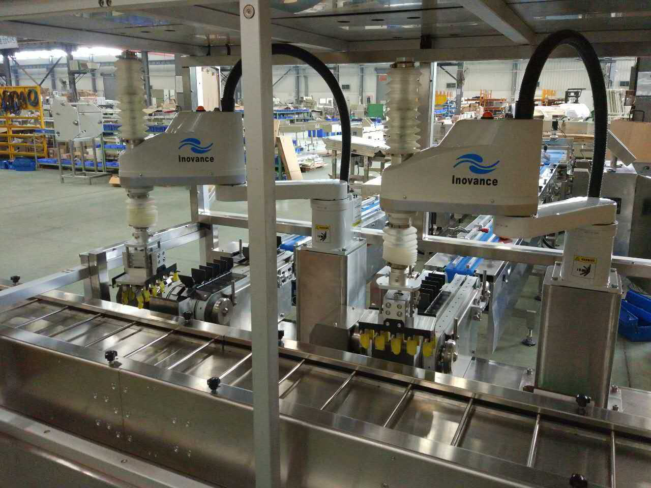 優(yōu)勢:以多代少等效率取代食品包裝行業(yè)delta機器人的常規(guī)應用,傳感器形式動態(tài)抓取,穩(wěn)定可靠,大大縮減成本,節(jié)省安裝空間。